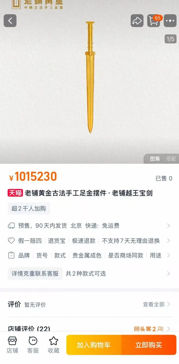 这把800克的黄金越王剑,在过去的2年时间里涨了37万元,涨幅近56%。根据网友贴出的旗舰店售价截图,2023年5月越王剑的售价为64.8万元,2024年7月为78.95万元,2025年2月价格进一步攀升至87.3万元,目前越王剑的售价约101.5万元。 同期,现货黄金从2000美元/盎司涨到了目前的3400美元/盎司以上。