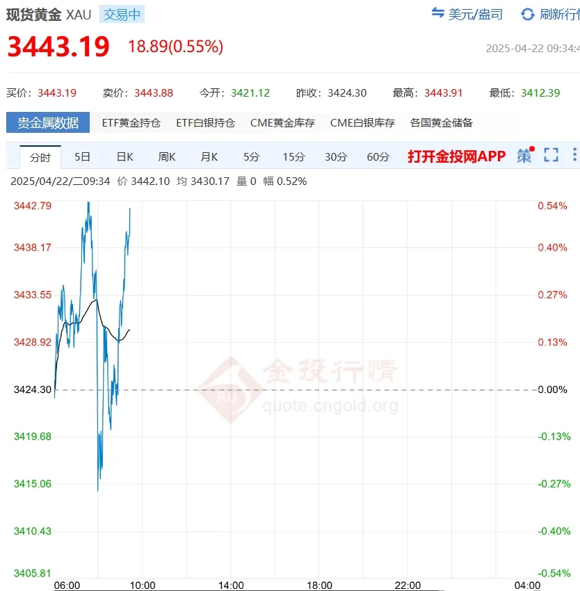 今早的表现依旧刺激,截至上午9点半左右,纽约商品交易所黄金期货价格报每盎司3443.19美元。