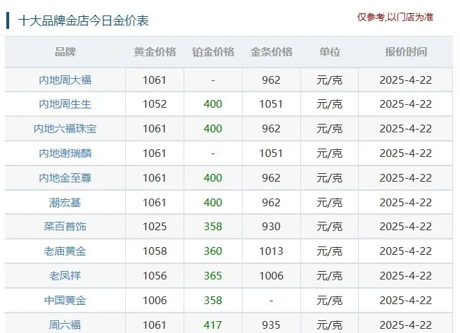 今日,多家品牌金店足金饰品报价已超出每克1060元。